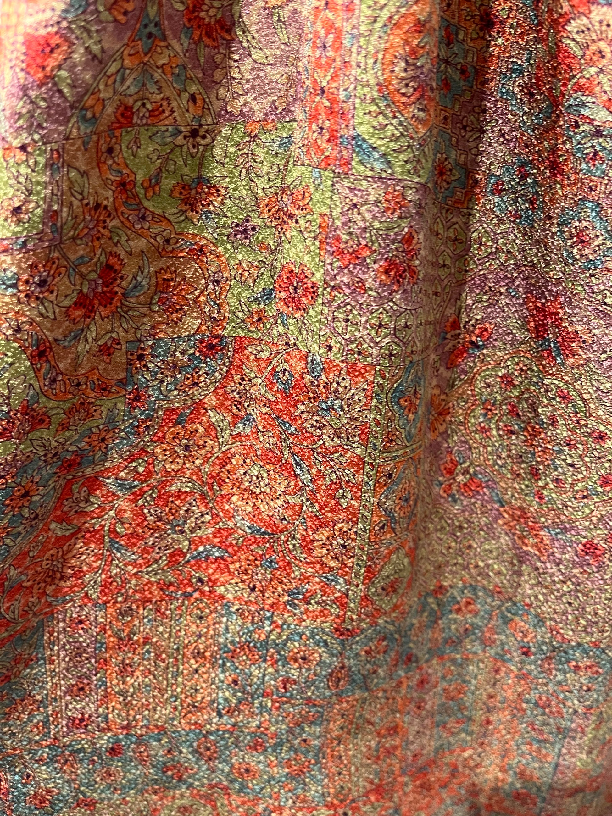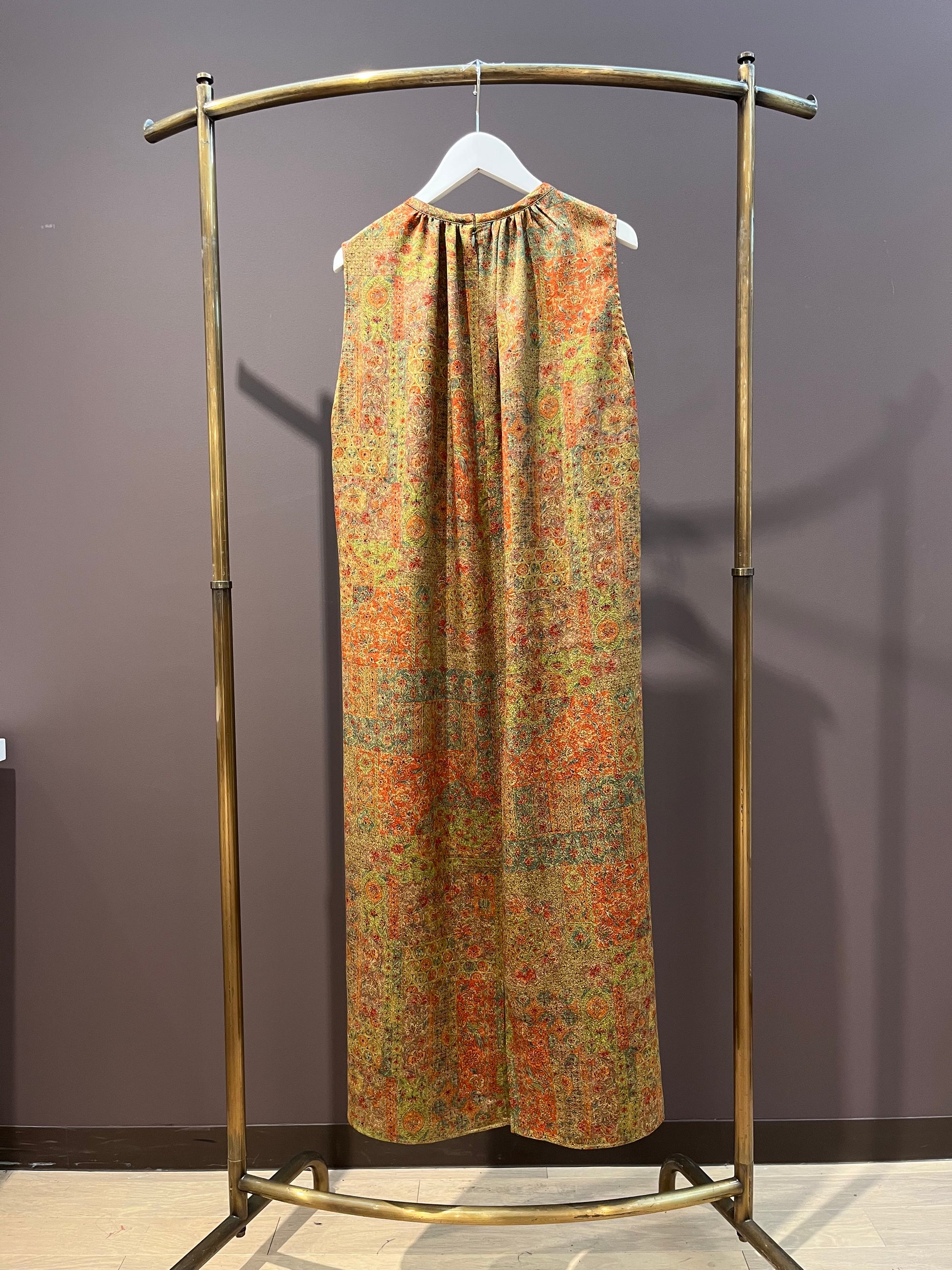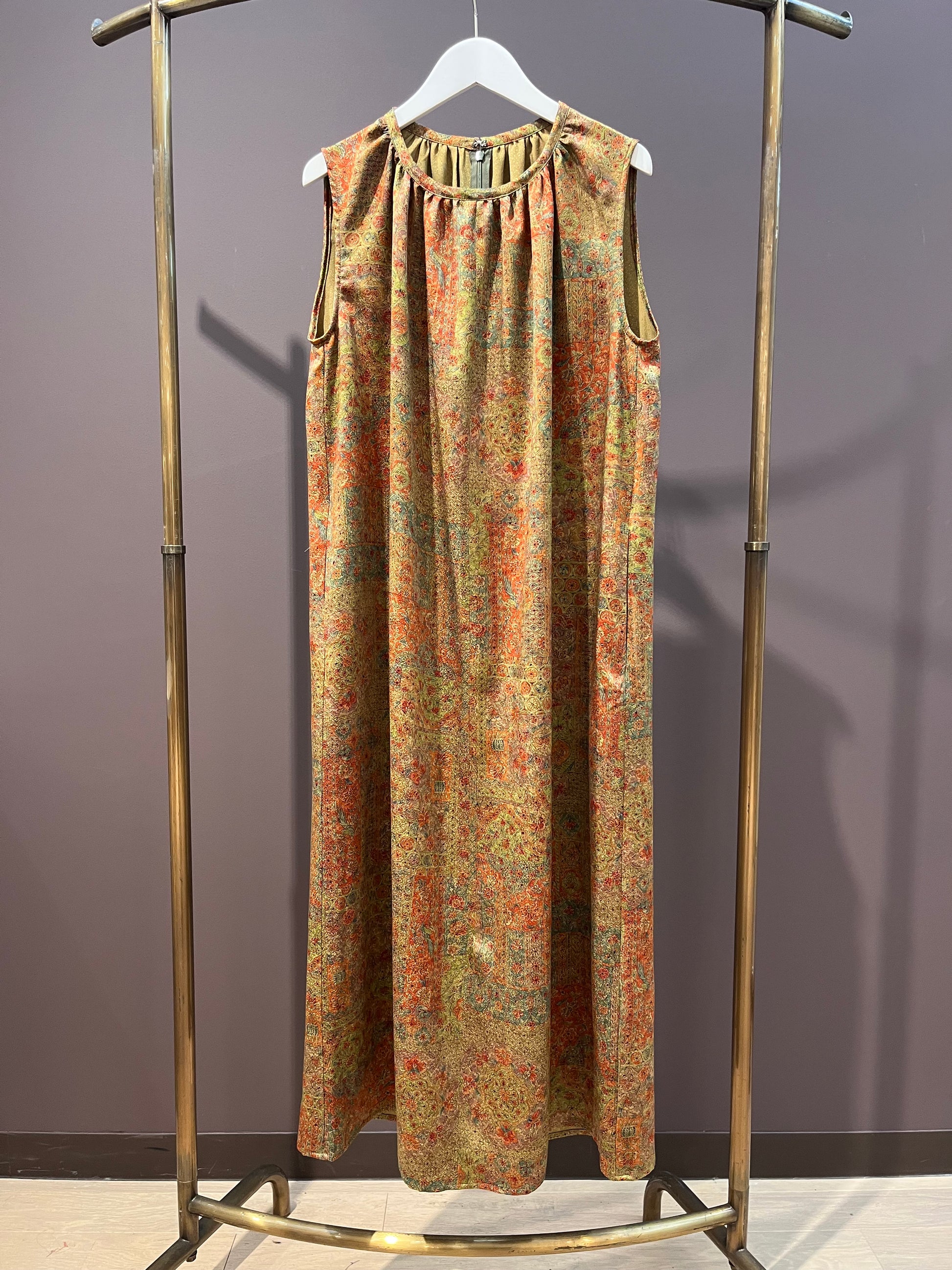 印度更紗紋様のオリーブと朱色が混ざり合ったエスニック感満載のワンピース。