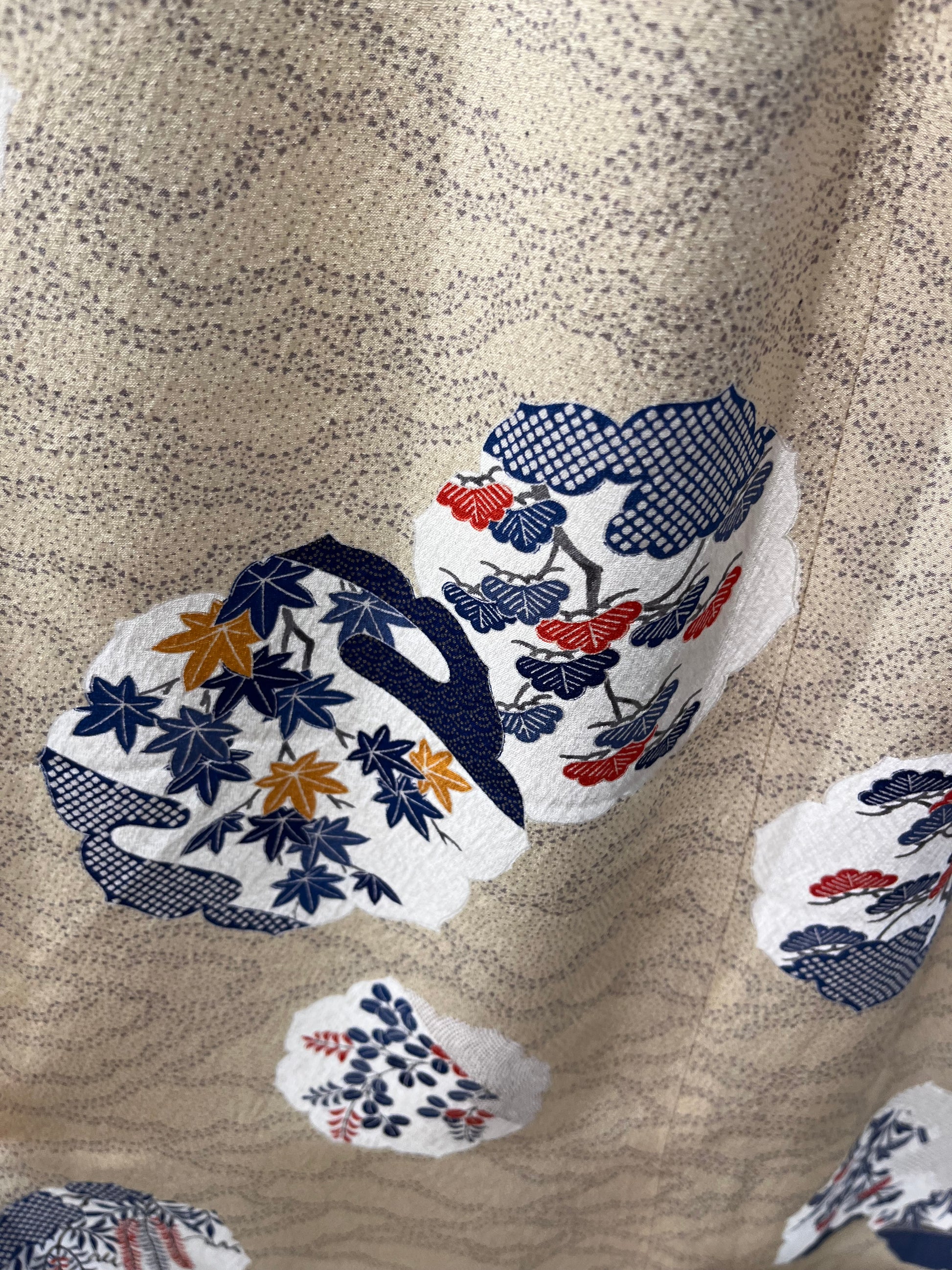 クリーム色がベースに大きな雪輪の中に白とネイビーで古典柄を描いた1枚。