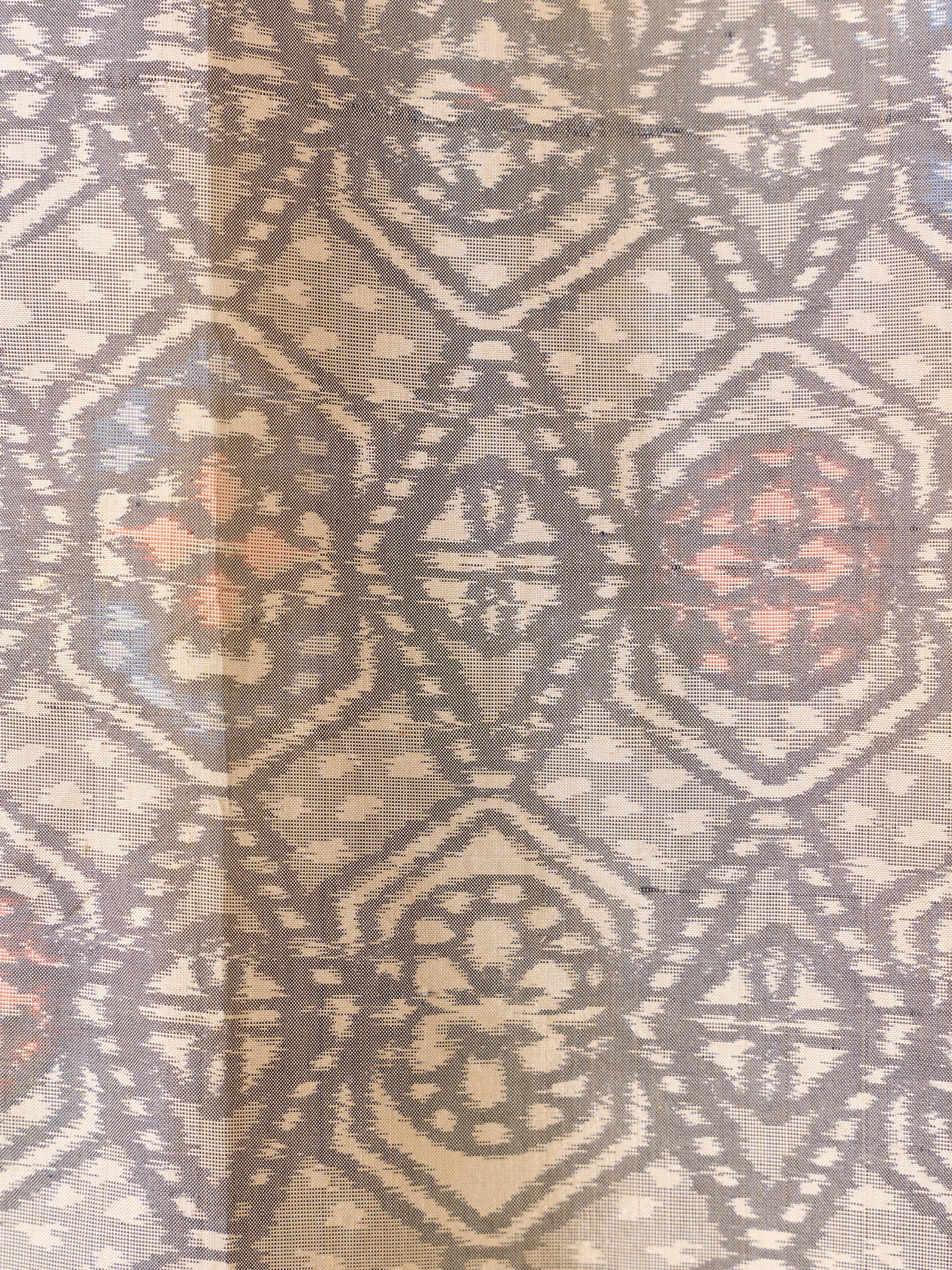 The pattern is a geometric pattern typical of Oshima Tsumugi.