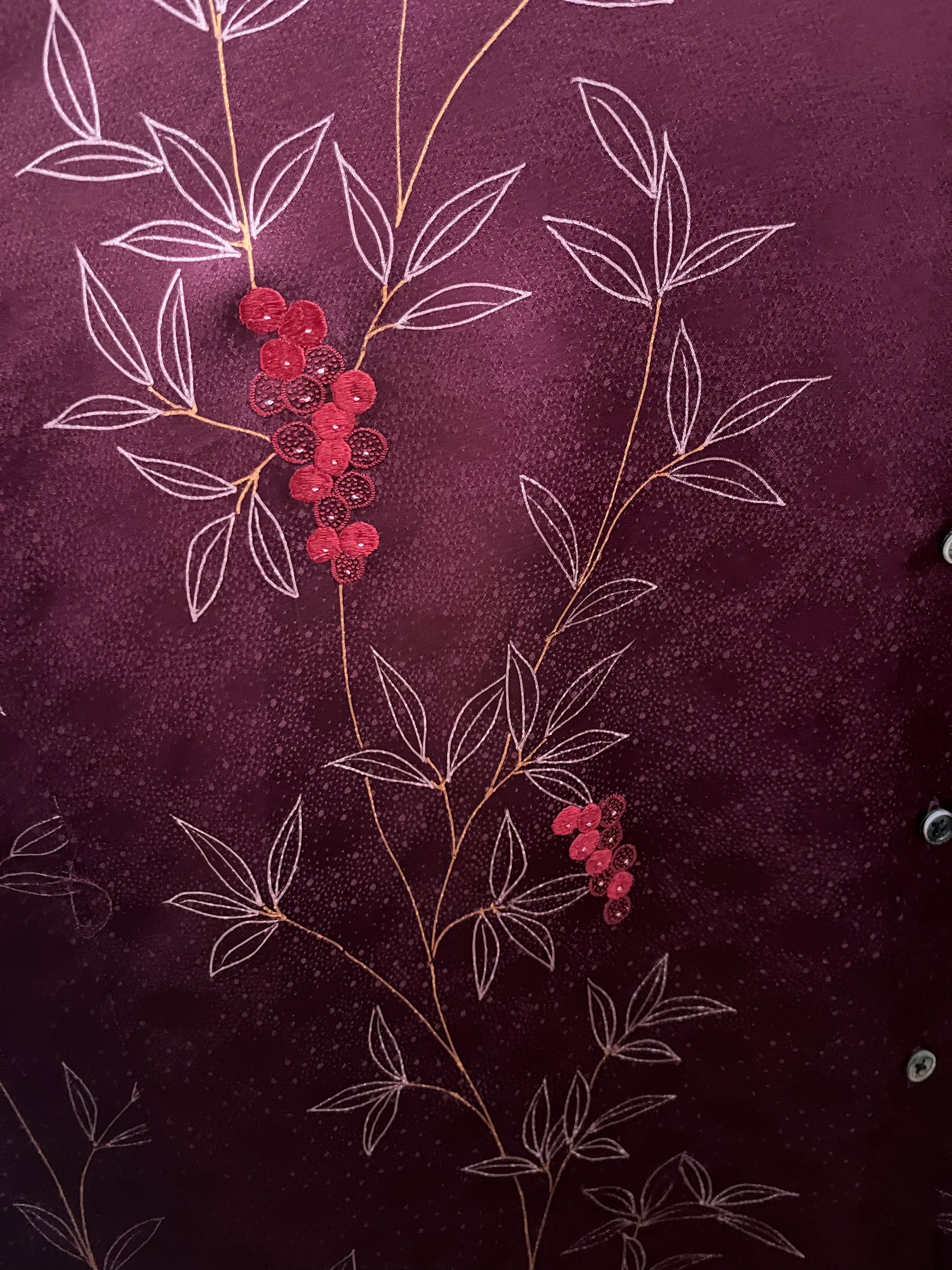濃い紫に南天の赤の刺繍が施されており、贅沢にも霰の地文様まで描かれたお着物からお作りしております。