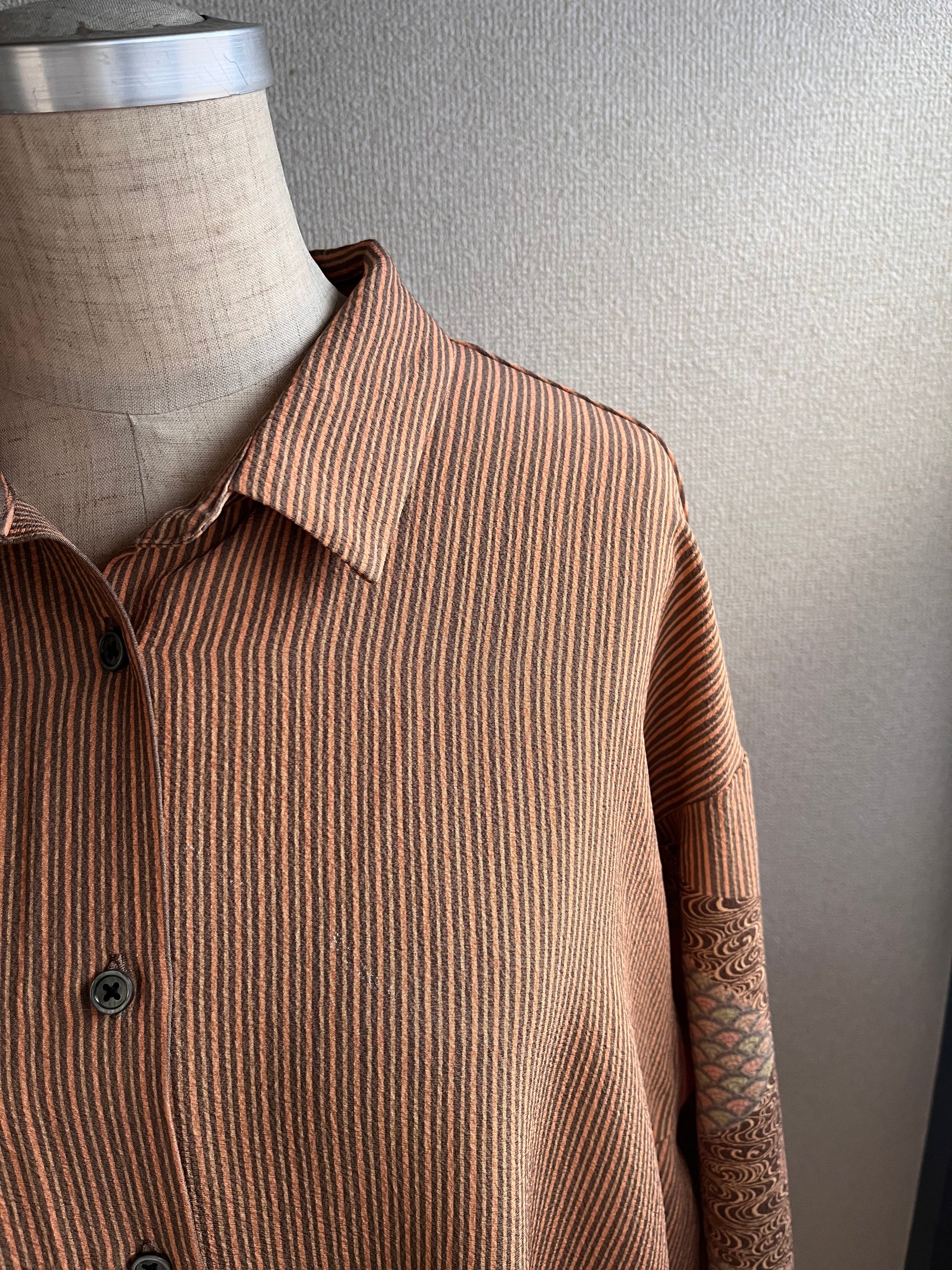 オレンジ・ブラウンのストライプに同色のお柄が裾と両袖、そして背中のヨーク部分に配置しております。