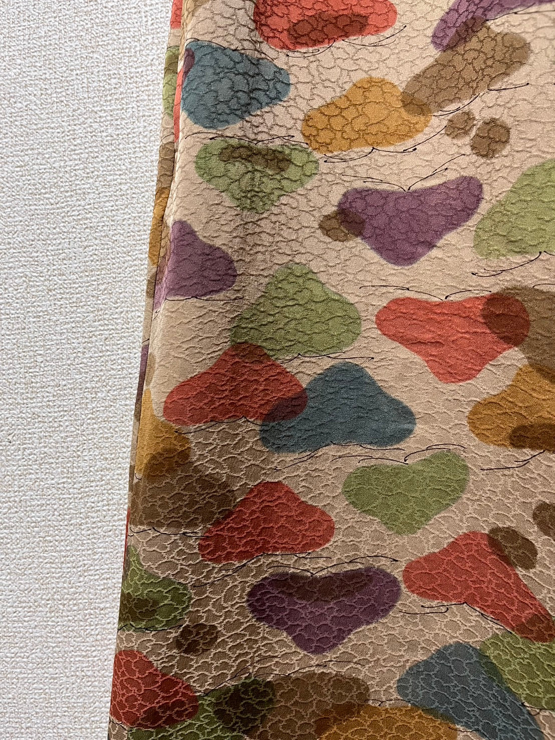 濃い目のベージュに色とりどりの雲柄を描いた1枚。