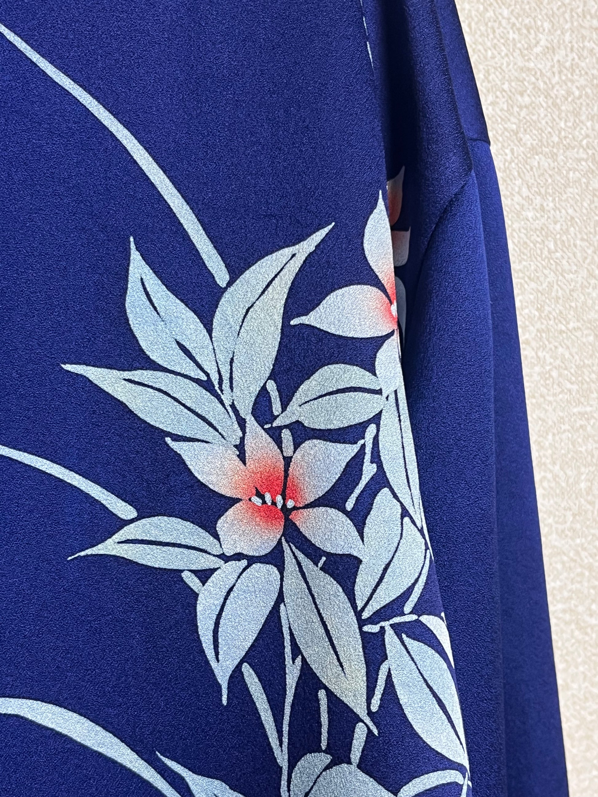 生地に光沢もあり、青の色が美しく、とても着物らしい一枚です。