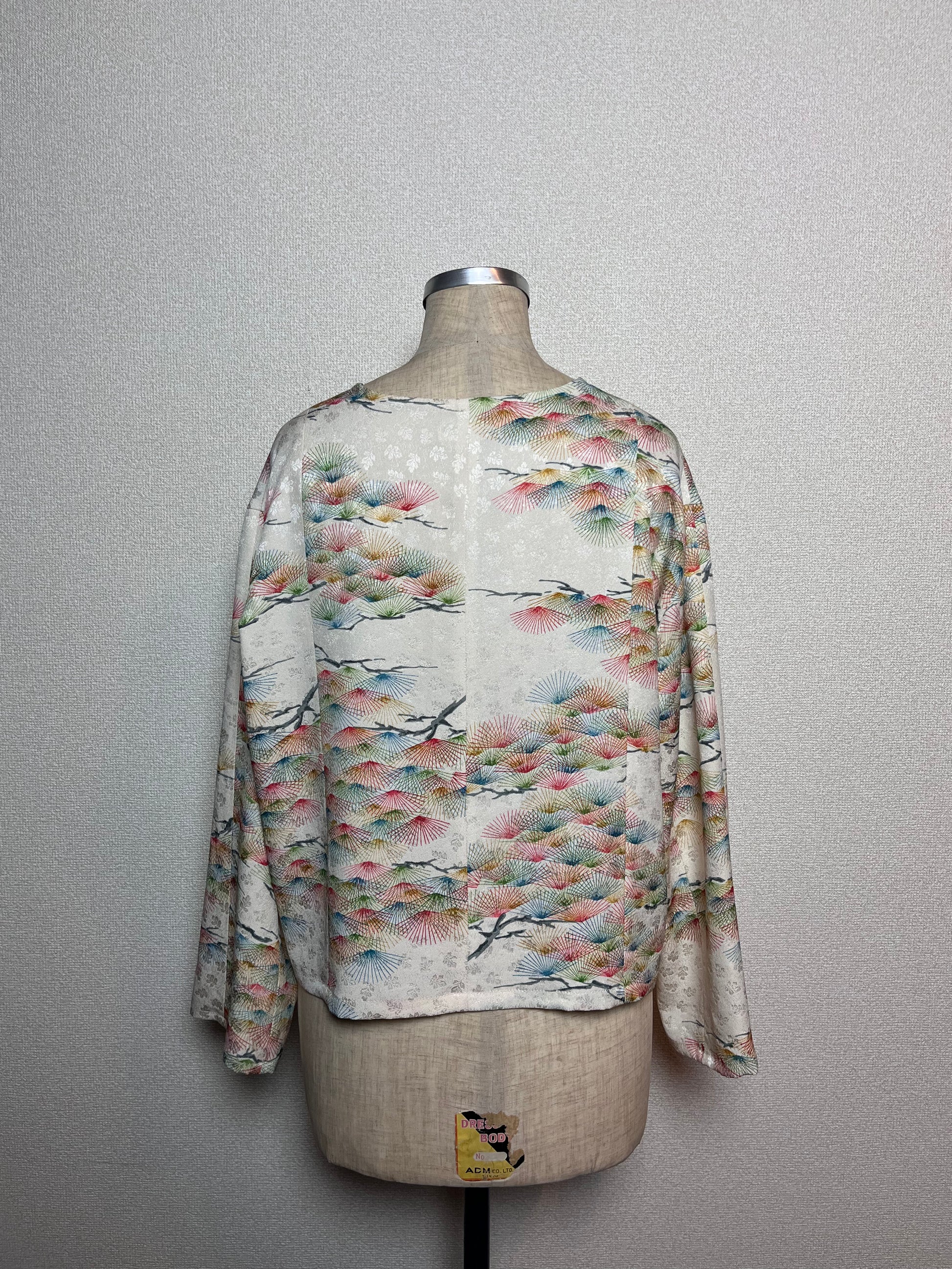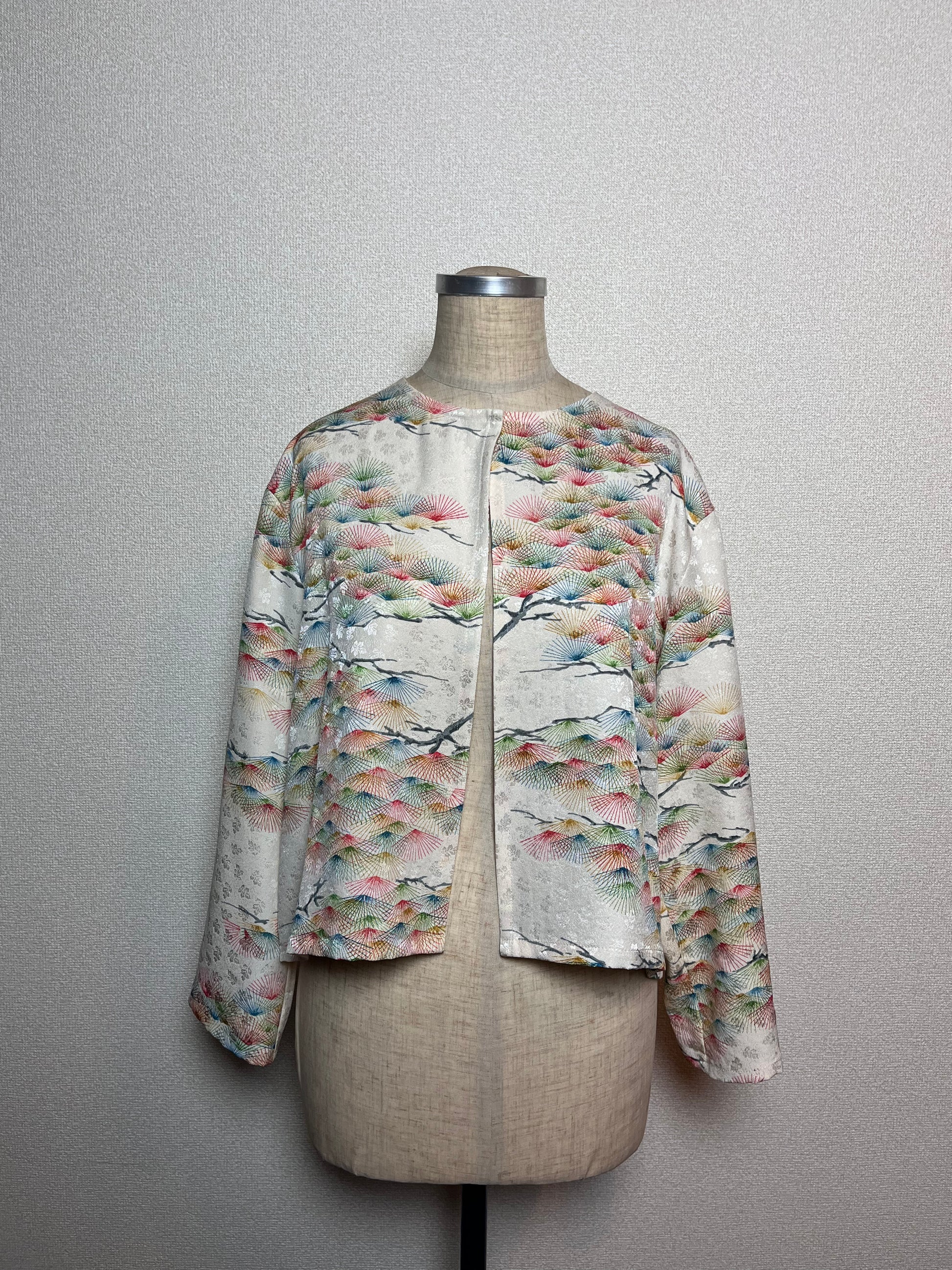 着物1反からパンツやワンピースなどの大きなアイテムを仕立てたあとに残る生地を活かして作った、カーディガンです。